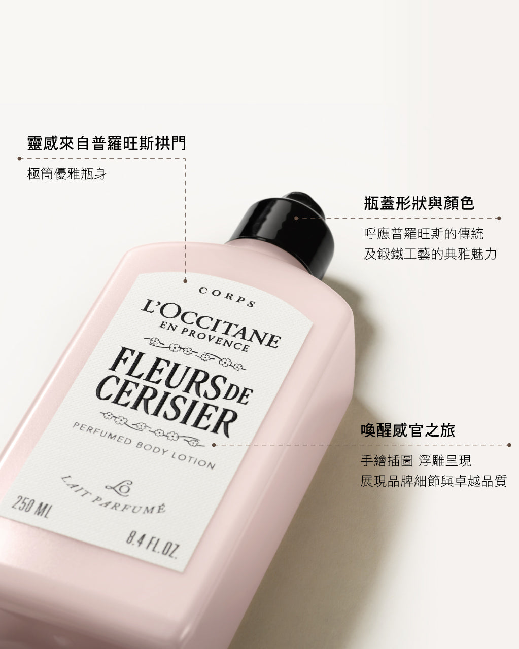蘊含來自普羅旺斯呂貝宏(Luberon)地區的櫻桃萃取及乳油木果油,能加強肌膚保濕。添加葡萄籽油和向日葵籽油能有效滋潤,並迅速吸收滲透,質地細緻豐潤卻能迅速被肌膚吸收,能保濕肌膚,同時帶來閃耀光澤,呈現細緻柔膚質與迷人花香。