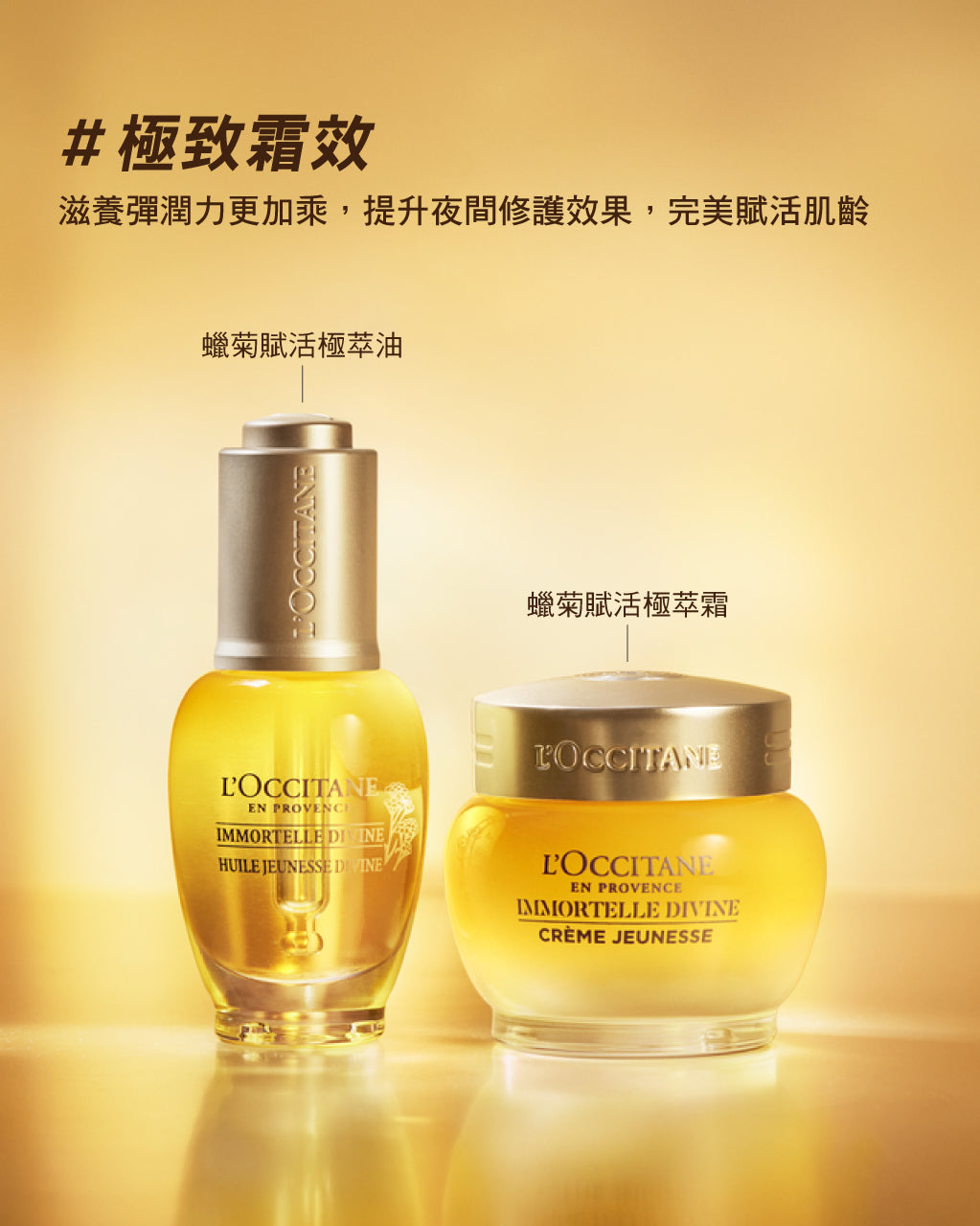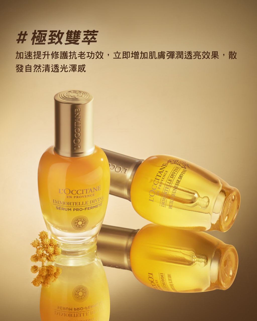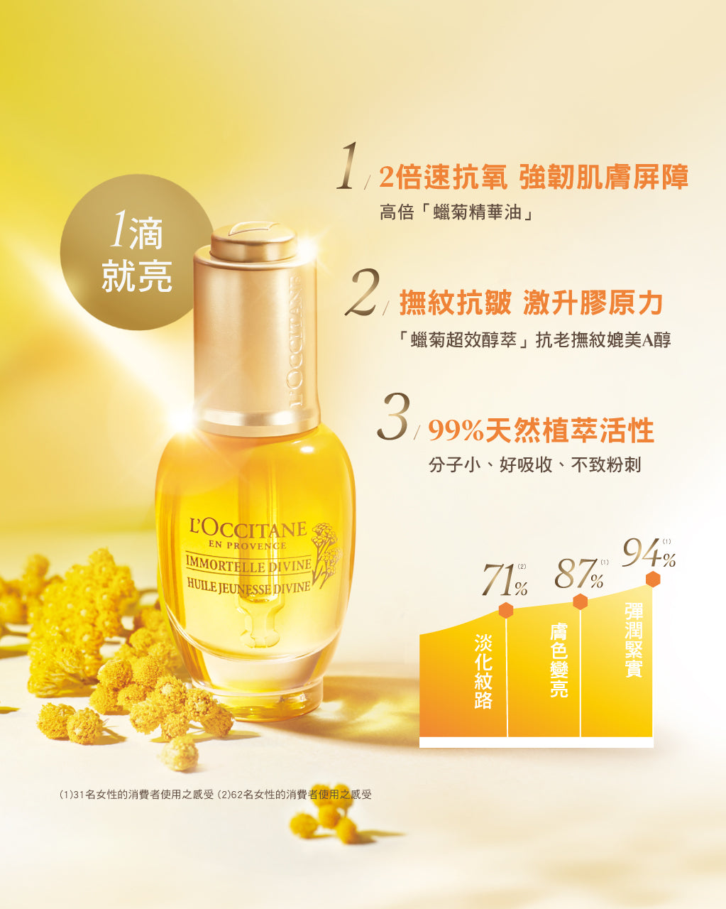 極致雙萃:[蠟菊賦活極萃油+蠟菊賦活極萃]1:1混合使用:使肌膚更加柔嫩,散發自然輕透光彩。