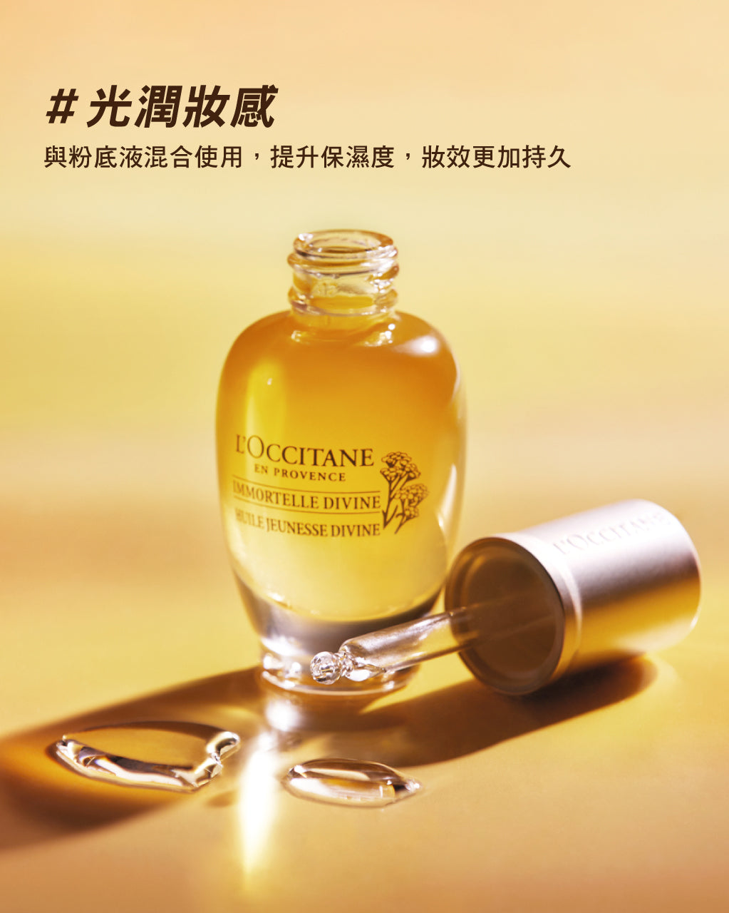 一滴升級保養、成就逆齡美肌,讓肌膚與時間唱反調!奢華淡雅的金色玻璃瓶中滿載金黃抗老能量,質地豐潤卻能迅速吸收,顛覆對美容油的刻板印象,只要1滴,就能呈現迷人光采好氣色。